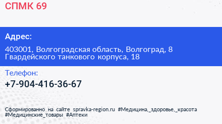 СПМК-69 по адресу 403001, Волгоградская область, Волгоград, 8 Гвардейского танкового корпуса, 18 в дальнейшем Организация, размещена в следующих категориях: