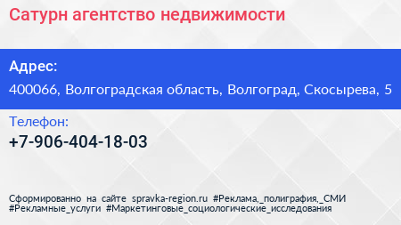 Сатурн, агентство недвижимости по адресу 400066, Волгоградская область, Волгоград, Скосырева, 5 в дальнейшем Организация, размещена в следующих категориях: