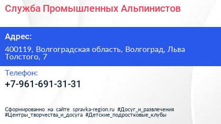 Служба Промышленных Альпинистов по адресу 400119, Волгоградская область, Волгоград, Льва Толстого, 7 в дальнейшем Организация, размещена в следующих категориях: