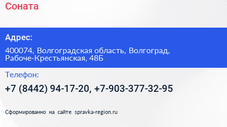 Соната по адресу 400074, Волгоградская область, Волгоград, Рабоче-Крестьянская, 48Б в дальнейшем Организация, размещена в следующих категориях: