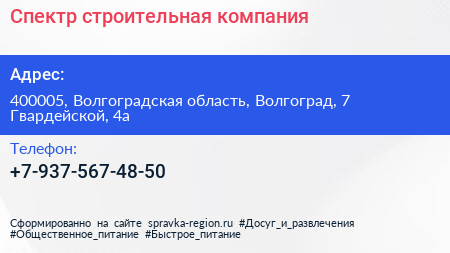 Спектр, строительная компания по адресу 400005, Волгоградская область, Волгоград, 7 Гвардейской, 4а в дальнейшем Организация, размещена в следующих категориях: