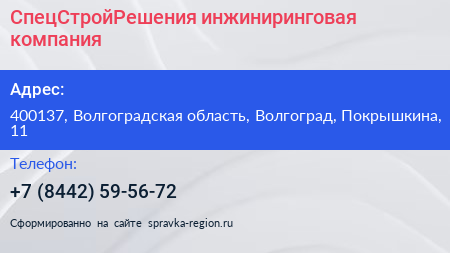 СпецСтройРешения, инжиниринговая компания по адресу 400137, Волгоградская область, Волгоград, Покрышкина, 11 в дальнейшем Организация, размещена в следующих категориях: