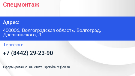 Спецмонтаж по адресу 400006, Волгоградская область, Волгоград, Дзержинского, 3 в дальнейшем Организация, размещена в следующих категориях: