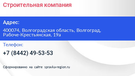 Строительная компания по адресу 400074, Волгоградская область, Волгоград, Рабоче-Крестьянская, 19а в дальнейшем Организация, размещена в следующих категориях: