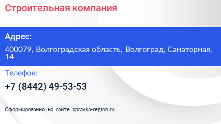 Строительная компания по адресу 400079, Волгоградская область, Волгоград, Санаторная, 14 в дальнейшем Организация, размещена в следующих категориях: