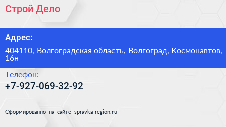 Строй-Дело по адресу 404110, Волгоградская область, Волгоград, Космонавтов, 16н в дальнейшем Организация, размещена в следующих категориях: