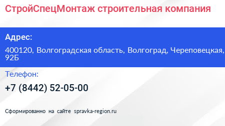 СтройСпецМонтаж, строительная компания по адресу 400120, Волгоградская область, Волгоград, Череповецкая, 92Б в дальнейшем Организация, размещена в следующих категориях: