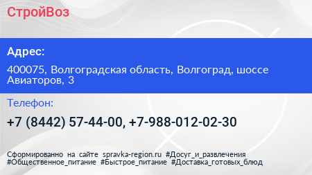 СтройВоз по адресу 400075, Волгоградская область, Волгоград, шоссе Авиаторов, 3 в дальнейшем Организация, размещена в следующих категориях: