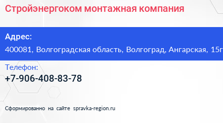 Стройэнергоком, монтажная компания по адресу 400081, Волгоградская область, Волгоград, Ангарская, 15г в дальнейшем Организация, размещена в следующих категориях: