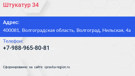 Штукатур 34 по адресу 400081, Волгоградская область, Волгоград, Нильская, 4а в дальнейшем Организация, размещена в следующих категориях: