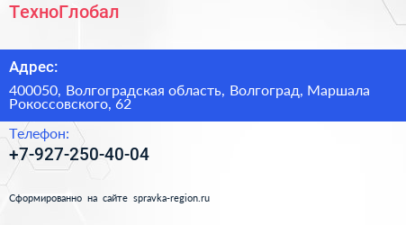 ТехноГлобал по адресу 400050, Волгоградская область, Волгоград, Маршала Рокоссовского, 62 в дальнейшем Организация, размещена в следующих категориях: