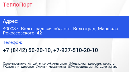 ТеплоПорт по адресу 400087, Волгоградская область, Волгоград, Маршала Рокоссовского, 42 в дальнейшем Организация, размещена в следующих категориях: