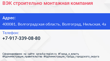 ВЭК, строительно-монтажная компания по адресу 400081, Волгоградская область, Волгоград, Нильская, 4а в дальнейшем Организация, размещена в следующих категориях: