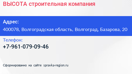 ВЫСОТА, строительная компания по адресу 400078, Волгоградская область, Волгоград, Базарова, 20 в дальнейшем Организация, размещена в следующих категориях: