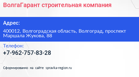ВолгаГарант, строительная компания по адресу 400012, Волгоградская область, Волгоград, проспект Маршала Жукова, 88 в дальнейшем Организация, размещена в следующих категориях: