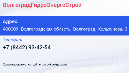ВолгоградГидроЭнергоСтрой по адресу 400009, Волгоградская область, Волгоград, Хользунова, 3 в дальнейшем Организация, размещена в следующих категориях: