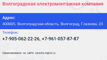 Волгоградская электромонтажная компания по адресу 400005, Волгоградская область, Волгоград, Глазкова, 23 в дальнейшем Организация, размещена в следующих категориях: