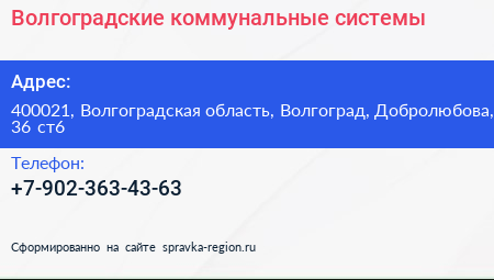 Волгоградские коммунальные системы по адресу 400021, Волгоградская область, Волгоград, Добролюбова, 36 ст6 в дальнейшем Организация, размещена в следующих категориях: