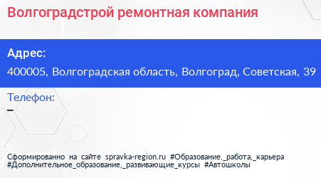 Волгоградстрой, ремонтная компания по адресу 400005, Волгоградская область, Волгоград, Советская, 39 в дальнейшем Организация, размещена в следующих категориях: