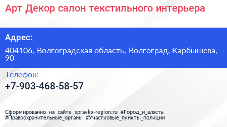 Арт Декор, салон текстильного интерьера по адресу 404106, Волгоградская область, Волгоград, Карбышева, 90 в дальнейшем Организация, размещена в следующих категориях: