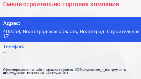 Емеля, строительно-торговая компания по адресу 400058, Волгоградская область, Волгоград, Строительная, 17 в дальнейшем Организация, размещена в следующих категориях: