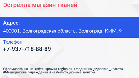 Эстрелла, магазин тканей по адресу 400001, Волгоградская область, Волгоград, КИМ, 9 в дальнейшем Организация, размещена в следующих категориях: