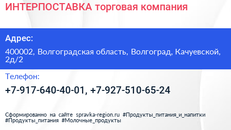 ИНТЕРПОСТАВКА, торговая компания по адресу 400002, Волгоградская область, Волгоград, Качуевской, 2д/2 в дальнейшем Организация, размещена в следующих категориях: