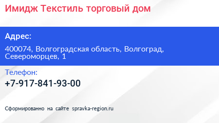 Имидж-Текстиль, торговый дом по адресу 400074, Волгоградская область, Волгоград, Североморцев, 1 в дальнейшем Организация, размещена в следующих категориях: