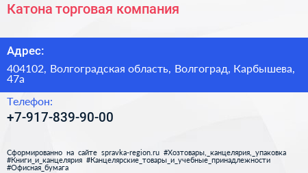Катона, торговая компания по адресу 404102, Волгоградская область, Волгоград, Карбышева, 47а в дальнейшем Организация, размещена в следующих категориях:
