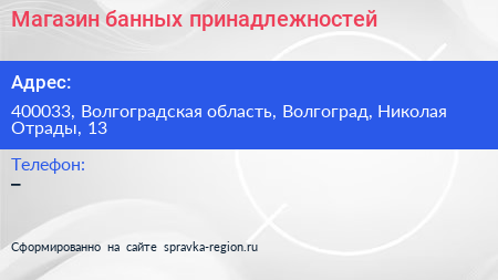 Магазин банных принадлежностей по адресу 400033, Волгоградская область, Волгоград, Николая Отрады, 13 в дальнейшем Организация, размещена в следующих категориях: