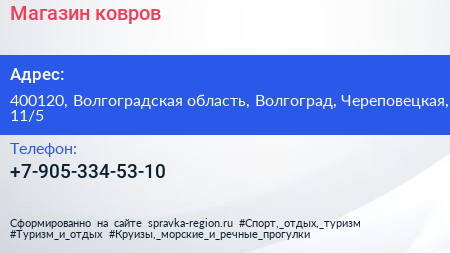 Магазин ковров по адресу 400120, Волгоградская область, Волгоград, Череповецкая, 11/5 в дальнейшем Организация, размещена в следующих категориях: