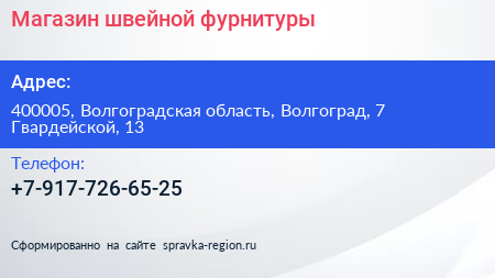Магазин швейной фурнитуры по адресу 400005, Волгоградская область, Волгоград, 7 Гвардейской, 13 в дальнейшем Организация, размещена в следующих категориях: