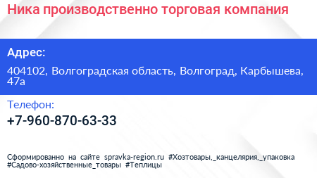 Ника, производственно-торговая компания по адресу 404102, Волгоградская область, Волгоград, Карбышева, 47а в дальнейшем Организация, размещена в следующих категориях: