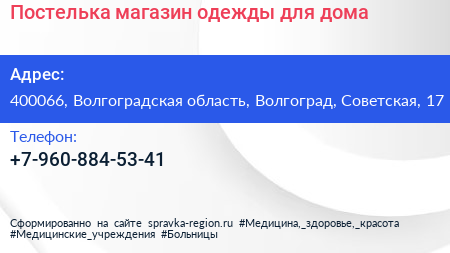 Постелька, магазин одежды для дома по адресу 400066, Волгоградская область, Волгоград, Советская, 17 в дальнейшем Организация, размещена в следующих категориях: