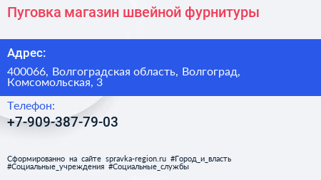 Пуговка, магазин швейной фурнитуры по адресу 400066, Волгоградская область, Волгоград, Комсомольская, 3 в дальнейшем Организация, размещена в следующих категориях:
