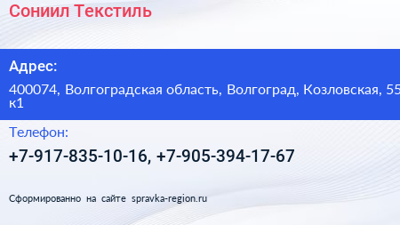 Сониил Текстиль по адресу 400074, Волгоградская область, Волгоград, Козловская, 55 к1 в дальнейшем Организация, размещена в следующих категориях: