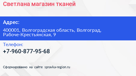 Светлана, магазин тканей по адресу 400001, Волгоградская область, Волгоград, Рабоче-Крестьянская, 9 в дальнейшем Организация, размещена в следующих категориях: