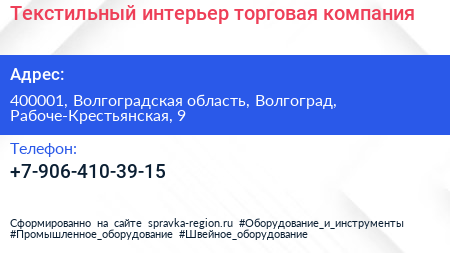 Текстильный интерьер, торговая компания по адресу 400001, Волгоградская область, Волгоград, Рабоче-Крестьянская, 9 в дальнейшем Организация, размещена в следующих категориях:
