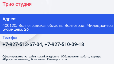 Трио, студия по адресу 400120, Волгоградская область, Волгоград, Милиционера Буханцева, 26 в дальнейшем Организация, размещена в следующих категориях: