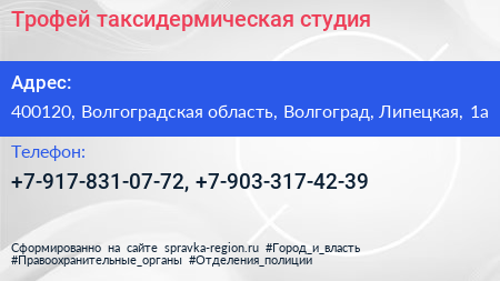 Трофей, таксидермическая студия по адресу 400120, Волгоградская область, Волгоград, Липецкая, 1а в дальнейшем Организация, размещена в следующих категориях: