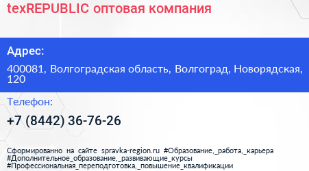 texREPUBLIC, оптовая компания по адресу 400081, Волгоградская область, Волгоград, Новорядская, 120 в дальнейшем Организация, размещена в следующих категориях: