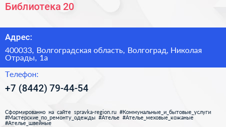 Библиотека №20 по адресу 400033, Волгоградская область, Волгоград, Николая Отрады, 1а в дальнейшем Организация, размещена в следующих категориях: