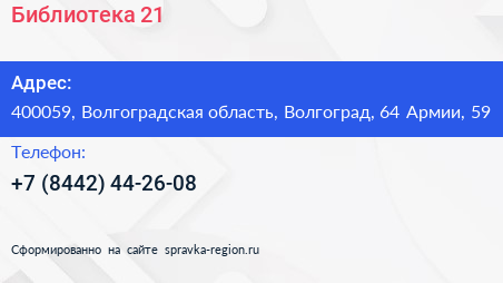Библиотека №21 по адресу 400059, Волгоградская область, Волгоград, 64 Армии, 59 в дальнейшем Организация, размещена в следующих категориях: