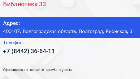 Библиотека №33 по адресу 400107, Волгоградская область, Волгоград, Рионская, 3 в дальнейшем Организация, размещена в следующих категориях:
