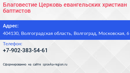 Благовестие, Церковь евангельских христиан-баптистов по адресу 404130, Волгоградская область, Волгоград, Московская, 6 в дальнейшем Организация, размещена в следующих категориях: