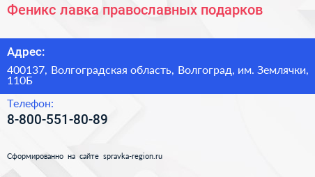 Феникс, лавка православных подарков по адресу 400137, Волгоградская область, Волгоград, им. Землячки, 110Б в дальнейшем Организация, размещена в следующих категориях: