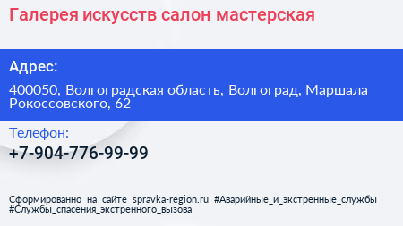 Галерея искусств, салон-мастерская по адресу 400050, Волгоградская область, Волгоград, Маршала Рокоссовского, 62 в дальнейшем Организация, размещена в следующих категориях: