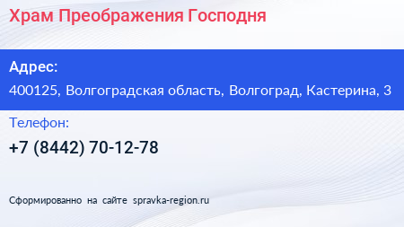 Храм Преображения Господня по адресу 400125, Волгоградская область, Волгоград, Кастерина, 3 в дальнейшем Организация, размещена в следующих категориях: