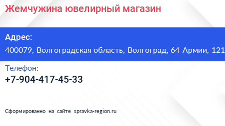 Жемчужина, ювелирный магазин по адресу 400079, Волгоградская область, Волгоград, 64 Армии, 121 в дальнейшем Организация, размещена в следующих категориях: