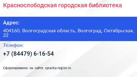 Краснослободская городская библиотека по адресу 404160, Волгоградская область, Волгоград, Октябрьская, 22 в дальнейшем Организация, размещена в следующих категориях: